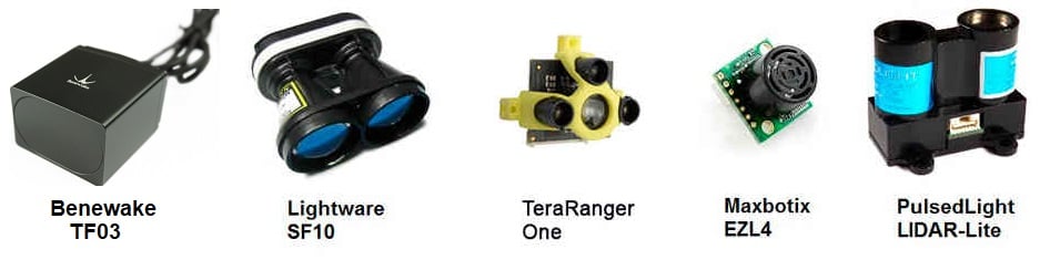 거리 측정기에는 다양한 종류가 있습니다. Lidar(레이저 또는 적외선을 사용하여 거리 측정), Sonar(초음파 사용) 및 Radar(마이크로 RF 사용). 일부는 아날로그이며 타이밍이 물체까지의 거리를 나타내는 펄스를 생성하고 다른 일부는 UART 또는 I2C 또는 DroneCAN을 통해 직렬로 데이터 스트림을 전송하는 디지털입니다.