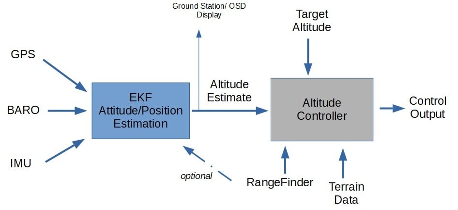 고도 컨트롤러에서 대상 ALT는 EKF2_ALT_MODE=3 이 활성화된 경우 GCS 또는 SD 카드의 지형 데이터 및/또는 활성화된 경우 거리계 범위 내에서 지상 거리의 RangeFinder 고도 판독값으로 수정할 수도 있습니다 . 두 경우 모두 EKF가 작동하는 한 GCS HUD 또는 OSD에 표시된 고도는 예상 고도입니다(그렇지 않으면 HOME에 상대적인 BARO 고도를 사용함).
