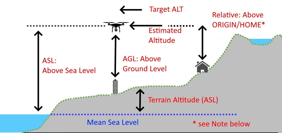PX4 문서에서는 “고도”라는 단어를 다양한 방식과 맥락에서 자주 사용합니다. 모든 “고도”가 같은 것을 의미하는 것은 아니며 주어진 상황에서 고도가 의미하는 바를 잘 이해하는 것이 예상되는 작동 및 동작을 이해하는 데 중요합니다.