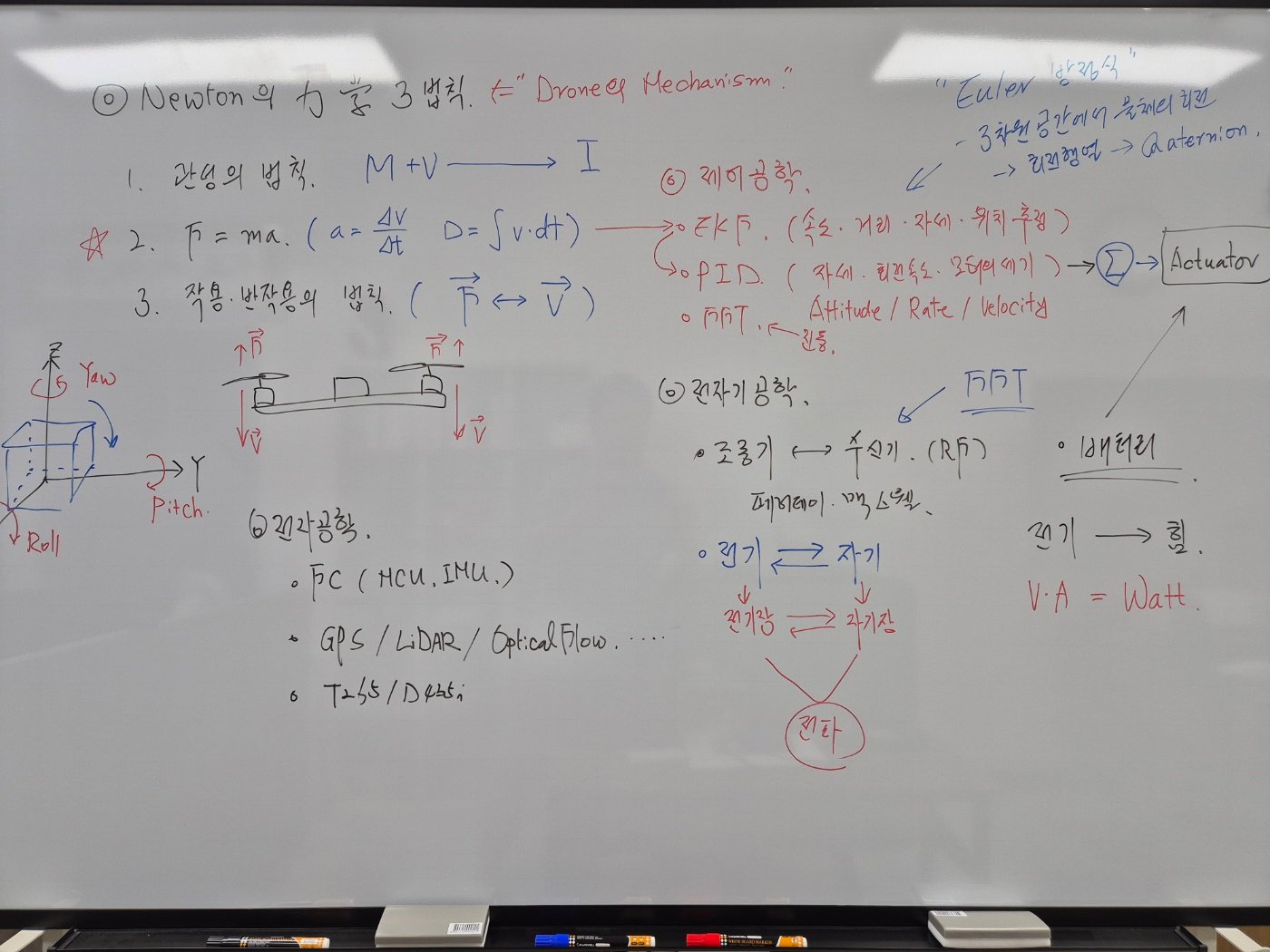 드론( Drone)이란, 물리학의 토대가 되는 뉴튼(Newton) 운동역학을 토대로 물체를 공중에 띄우기 위해 필요한 힘을 계산하며, 띄워진 물체를 제어하기 위해 제어공학의 EKF(Extended Kalman Filter), PID, FFT(Fast Fourier Transform)를 이용하고, 계산된 힘을 엑츄에이터(모터)에 제공하기 위해 전기공학이 사용 됩니다. 또한, 공중에 띄워진 물체를 조종하기 위해 전자기공학의 전파(전자기파)를 이용 합니다.