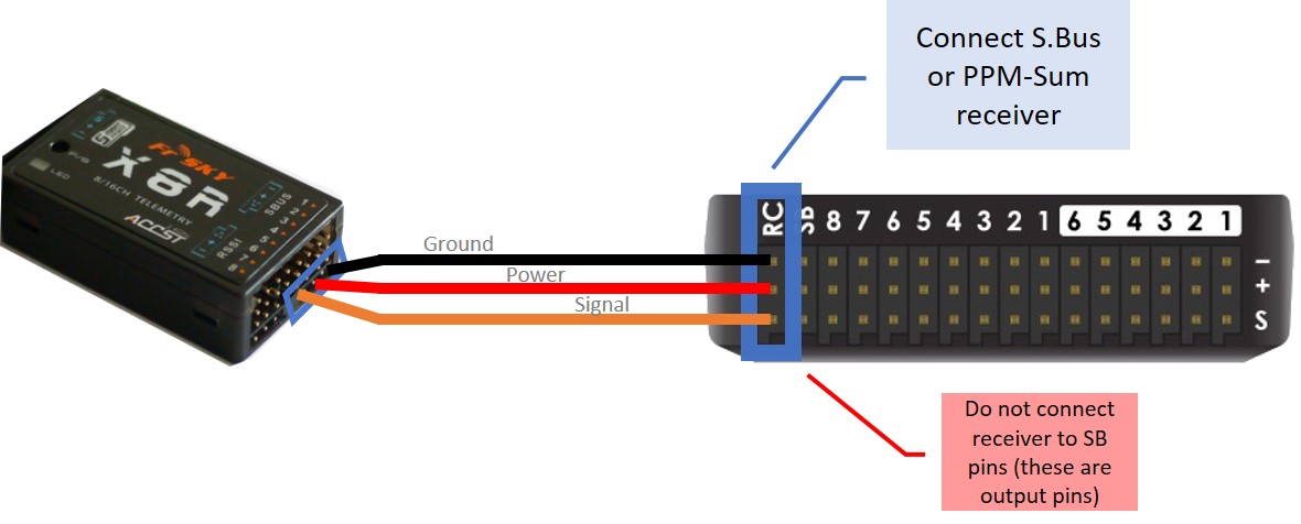 이러한 수신기는 일반적으로 자동 조종 장치의 RCin 또는 SBUS 입력 핀에 연결됩니다.