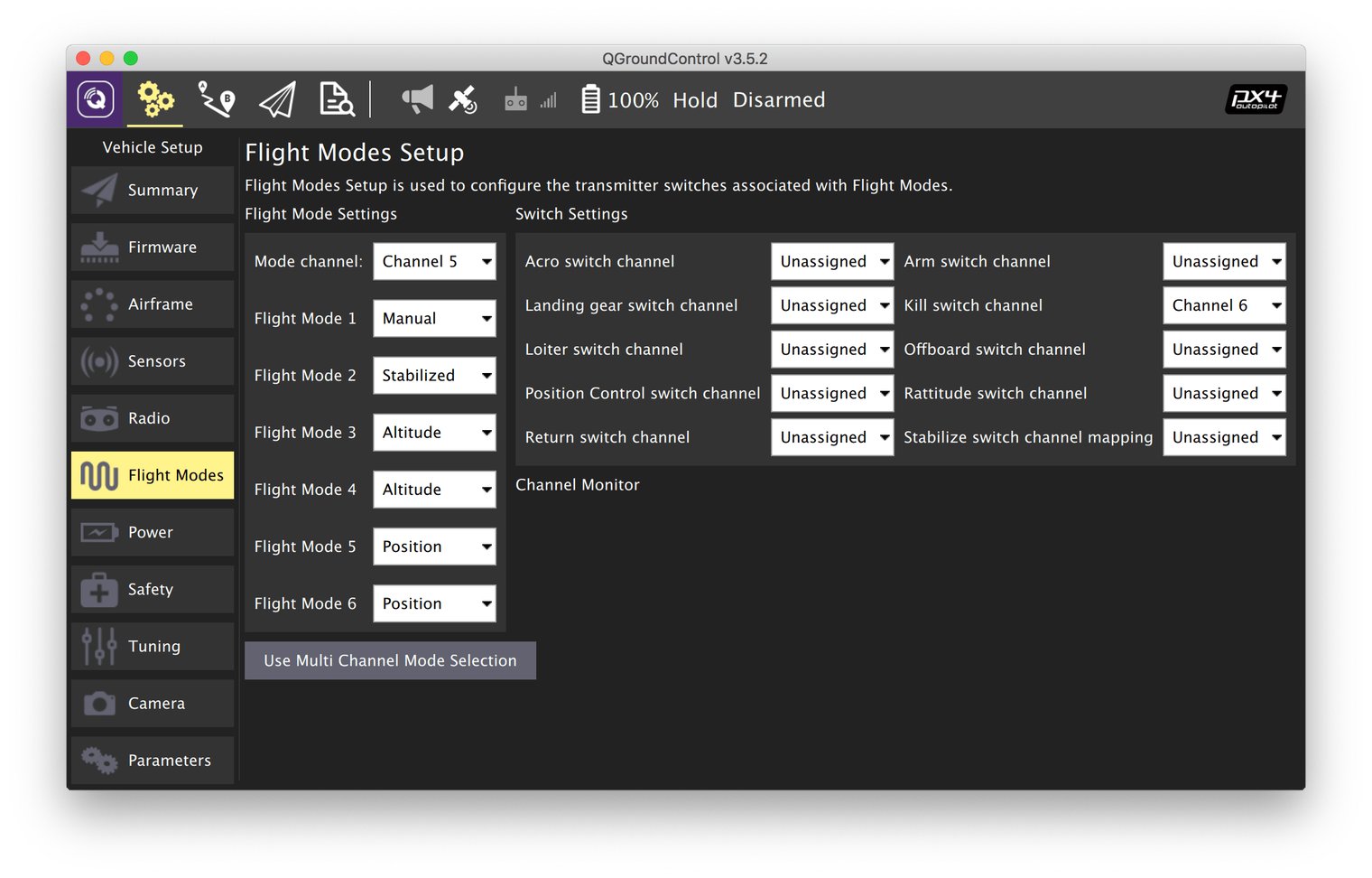 - 모드 채널을 SwC 스위치( 채널 5 )로 설정합니다 .