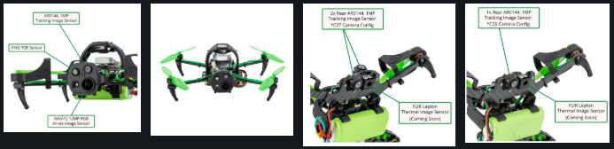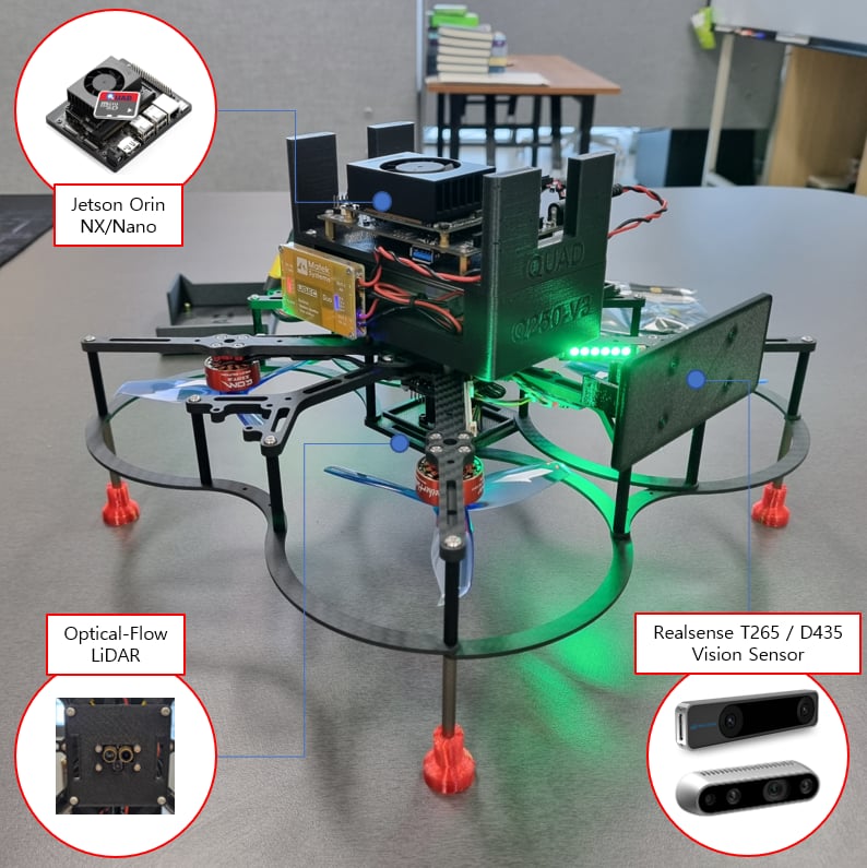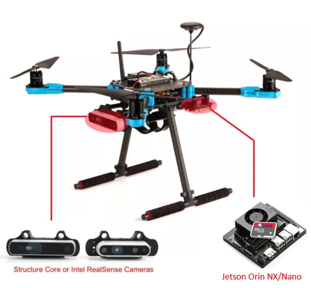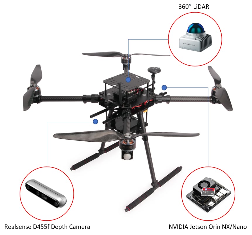 본 키트에는 PX4 비행 스택이 있는 비행 컨트롤러, 온보드 컴퓨터를 제어하는 Jetson Orin, 컴퓨터 비전을 사용하여 비행을 수행하기 위한 카메라 모듈, 인텔 Realsense T265 VIO 트래킹 카메라(단종)와 D435i 심도 카메라를 포함한 non-GPS 비전 카메라 및 사물인식 및 추적을 위한 AI 소프트웨어들이 옵션으로 포함 됩니다.