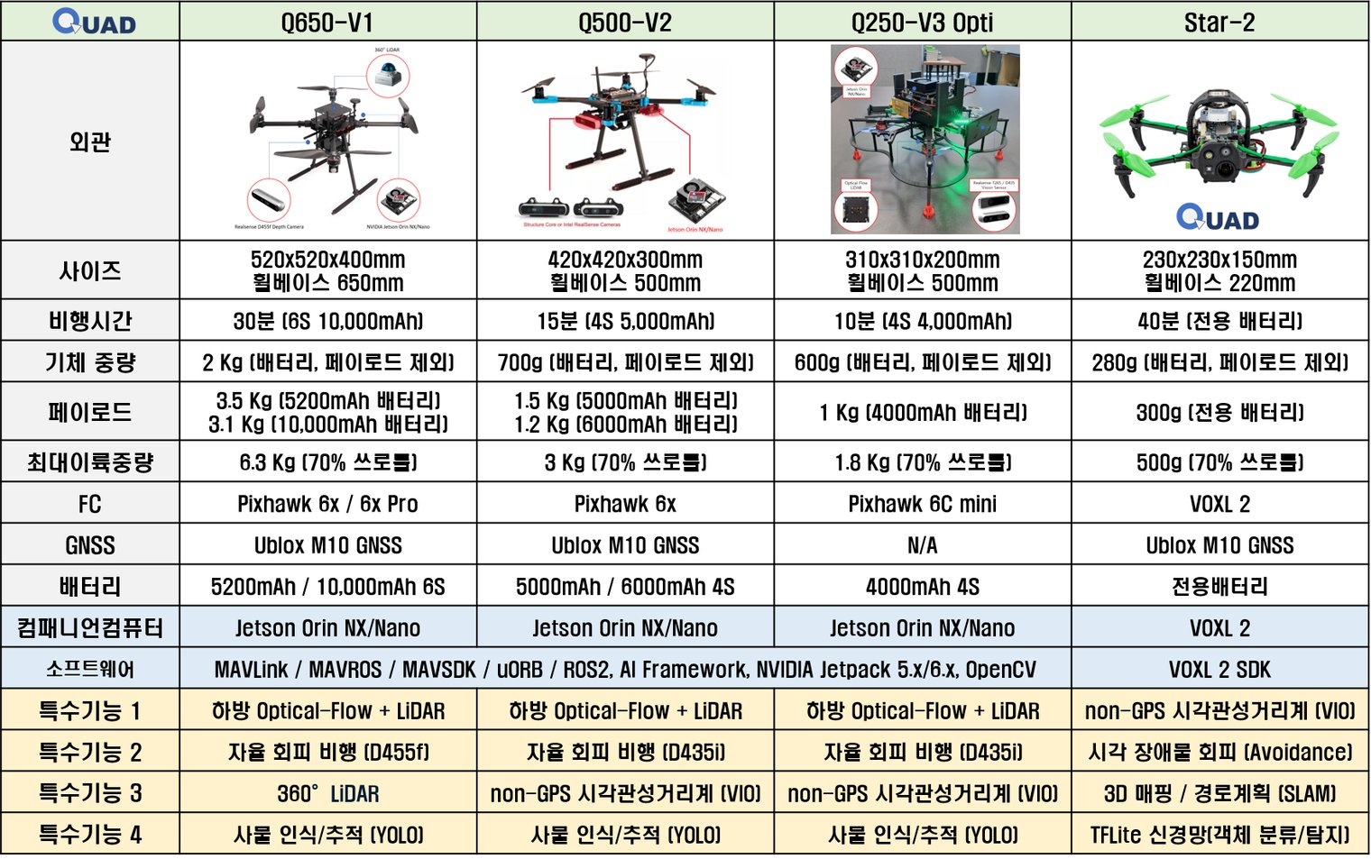쿼드(QUAD) 자율주행드론(키트)는 널리 사용되는 오픈 소스 구성 요소와 작업에 필요한 문서 및 라이브러리 세트로 구성된 프로그래밍 가능한 쿼드콥터 형태의 교육/연구용 개발 키트 입니다.