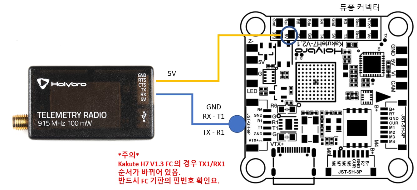 1. PX4와 Q250-V2 FC의 텔레메트리 연결을 위해서는 동봉된 UART1 to 텔레메트리 케이블을 사용 하시기 바랍니다.