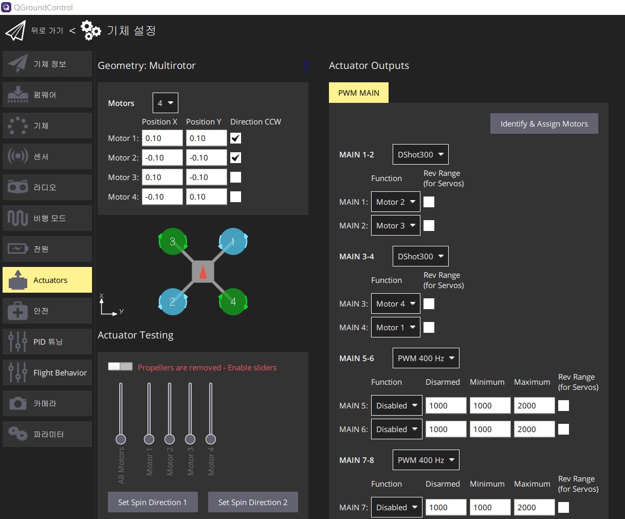 QUAD Q250 Quad 드론의 모터 설정은 아래와 같이 설정 합니다.