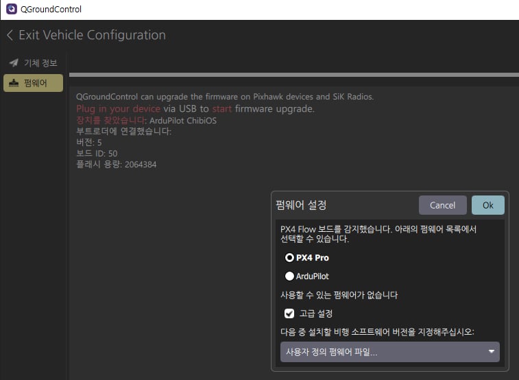 QGroundControl을 이용하여 펌웨어 업데이트를 수행합니다.