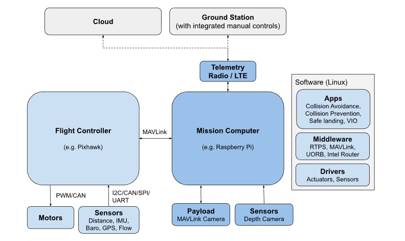 비행 컨트롤러는 일반 PX4 비행 스택을 실행하는 반면, 컴패니언 컴퓨터는 물체 회피 및 충돌 방지 와 같은 고급 기능을 제공합니다 . 두 시스템은 고속 직렬 또는 IP 링크를 사용하여 연결되며 일반적으로 MAVLink 프로토콜을 사용하여 통신합니다. 지상국 및 클라우드와의 통신은 일반적으로 보조 컴퓨터(예: MAVLink 라우터 사용)를 통해 라우팅됩니다.