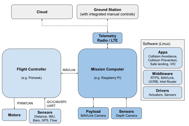 PX4 아키텍처 – FC + 미션컴퓨터는 일반 PX4 비행 스택을 실행하는 반면, 컴패니언 컴퓨터는 물체 회피 및 충돌 방지 와 같은 고급 기능을 제공합니다. 두 시스템은 고속 직렬 또는 IP 링크를 사용하여 연결되며 일반적으로 MAVLink 프로토콜을 사용하여 통신합니다. 지상국 및 클라우드와의 통신은 일반적으로 보조 컴퓨터(예: MAVLink 라우터 사용)를 통해 라우팅됩니다. PX4 시스템은 일반적으로 보조 컴퓨터에서 Linux OS를 실행합니다.