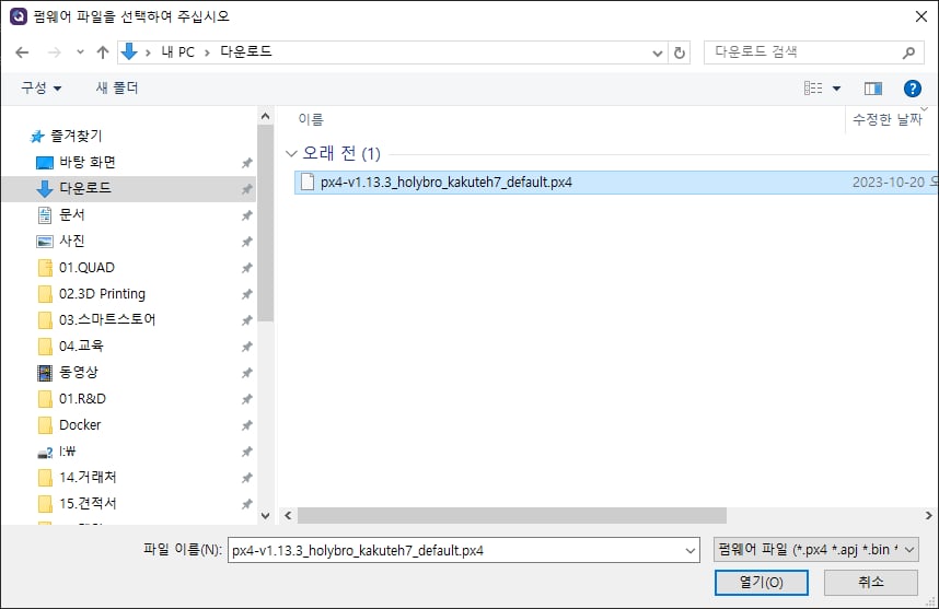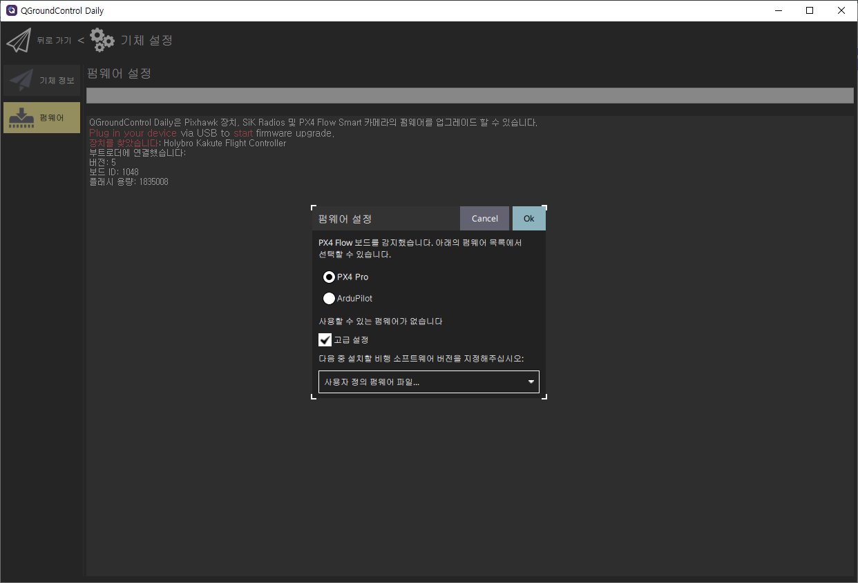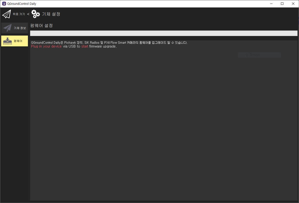 1. QGC의 기체설정 메뉴의 펌웨어 설정으로 이동 합니다. (기체와 USB 분리된 상태)