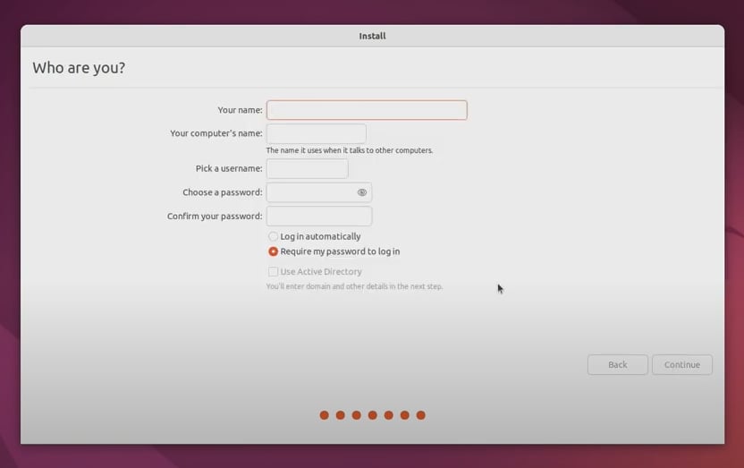 3-7. 이름, 컴퓨터 이름, 사용자 이름 선택, 암호 선택, 암호 확인을 작성하고 [Continue] 버튼을 클릭합니다.