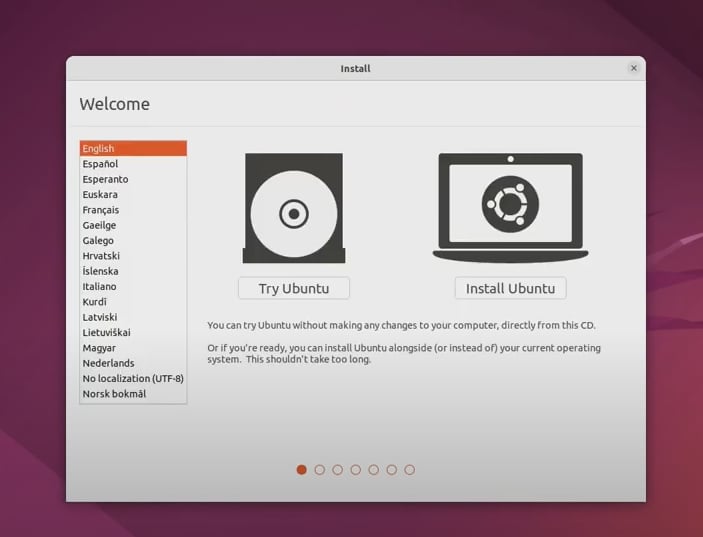 3-1. 설치할 언어를 선택하고 오른쪽 [Install Ubuntu] 메뉴를 클릭합니다.