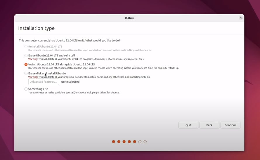 3-5. 설치 형식 화면에서 기존에 설치되어 있는 운영체제(OS)가 있을 경우 선택이 가능하고, 설치 디스크에 운영체제(OS)가 설치되어 있지 않을 경우 우분투(Ubuntu)로 선택하고 [Continue]를 클릭하여 설치 진행합니다.