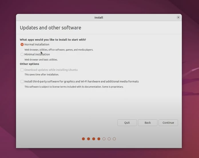 3-4. 소프트웨어 및 기타 소프트웨어서 일반 설치, 최소 설치로 선택 가능하고, 기타 설정을 체크하고 [Continue] 버튼을 클릭합니다.