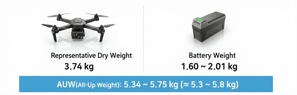 - AUW (All-Up Weight): 5.34–5.75 kg (≈ 5.3–5.8 kg)