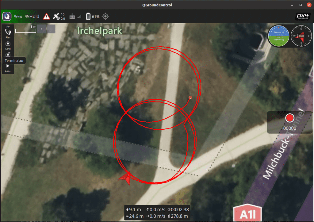 아래 코드를 실행하면 기체가 고도 상승 후 북, 남, 서, 동 방향으로 일정하게 속도를 내며 이동하는 정밀한 방위 기반 제어를 확인할 수 있습니다.
