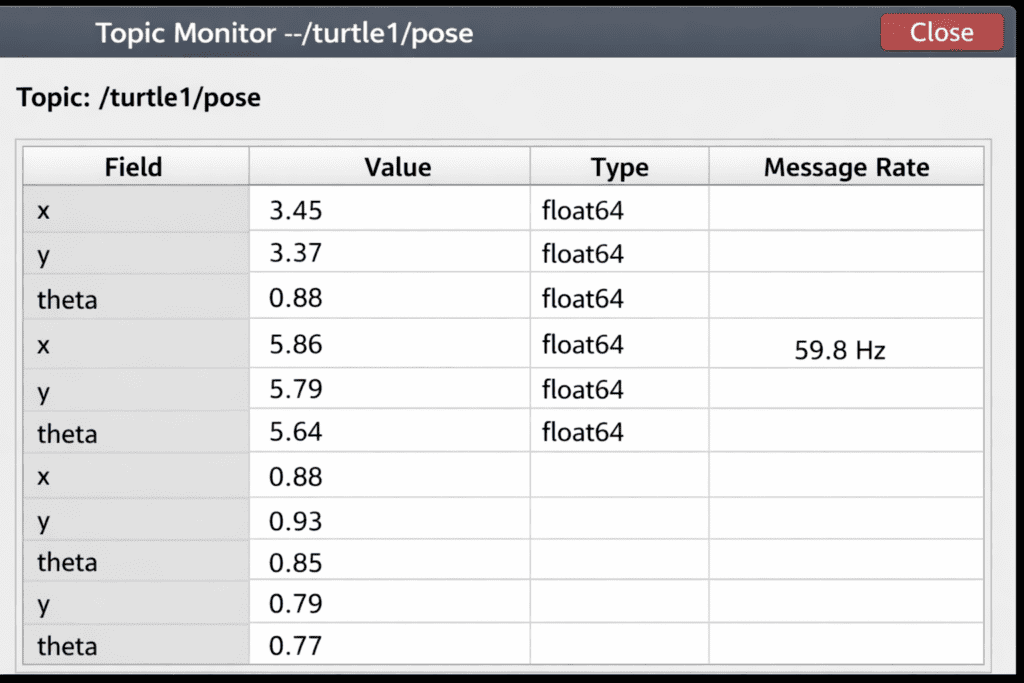 This plugin allows you to monitor the actual values of topics currently being exchanged in real-time. If you click the checkbox for the/turtle1/posetopic while the turtle is moving, you can directly see the numbers for the turtle’s current x, y coordinates and rotation angle (theta) changing in real-time. This is essential for checking if sensor values are coming in correctly during research.