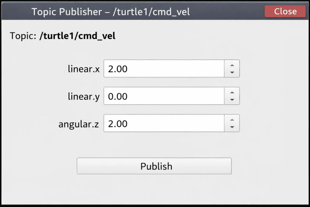 |You can publish topics and control nodes directly on the RQT GUI without terminal commands or Python code. If you select the/turtle1/cmd_veltopic, setlinear.xto 2.0 andangular.zto 1.0, and turn on the publication frequency at 1Hz, you can see the turtle automatically spinning in circles without keyboard operation. This is a great tool for unit testing to see if the robot motors respond properly before writing code.