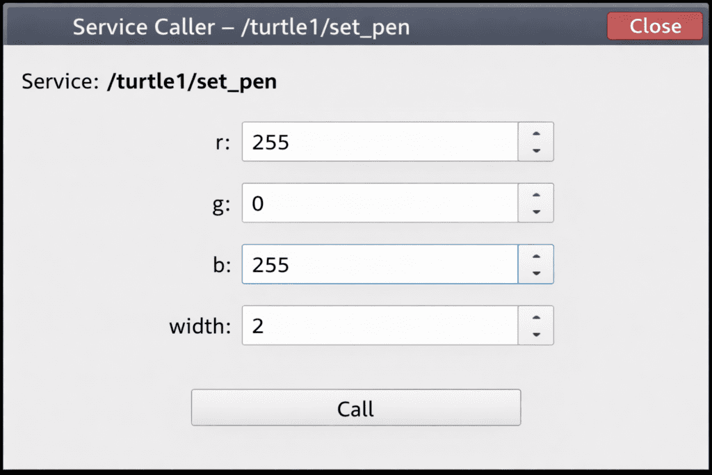 This plugin allows you to look up the list of services currently registered in the ROS2 network through a dropdown menu and call services directly by entering parameters. If you select the/turtle1/set_penservice, which changes the color of the trajectory the turtle draws, enter the desired color code in the r, g, b values, and press the ‘Call’ button, the turtle’s pen color changes immediately. You can verify service logic without writing complex service client code.