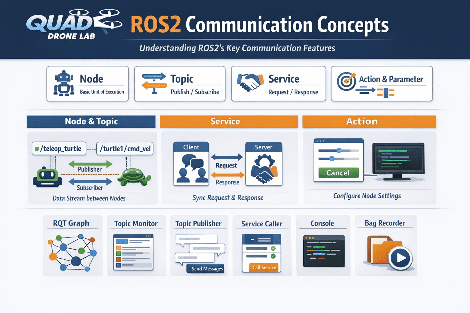In this Part 2, we will understand the core communication concepts (Node, Topic, Service, Action, Parameter) that form the backbone of ROS2, and we will kindly explore how to use ‘RQT’, the best visualization utility that allows you to grasp and control this complex communication state at a glance.